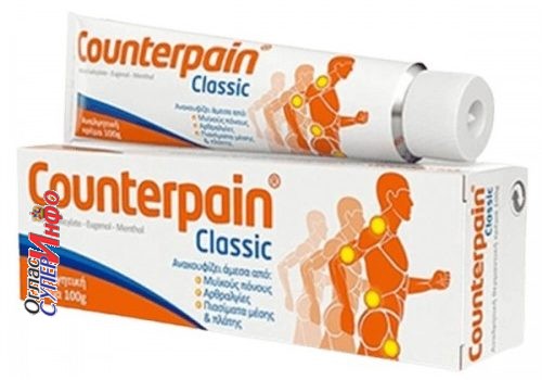 Deluje posle prvog mazanja , Counterpain Classic PharmaSwiss, ima široku primenu kod profesionalnih sportista rešava mnogo brze problem sportskih povreda . Counterpain Classic 100gr je krema koja ublažava bolove u mišićima zglobovima i reumatske tegobe kao i povrede nastale pri sportskim aktivnostima . Grčka krema perfektna za kičmene i reumatske probleme. Counterpain Classic kremu koriste profesionalni sportisti . . . a pre svega fudbaleri. Deluje odlično za bolove u mišićima, bolove u zglobovima, bolove u leđima, umirujući artritički bol. Counterpain – bezbolni krem proizvodi napravljeni od strane lokalnih analgetika iz grupe zajedničkog, mišića i skeletnih poremećaja. Mišićni bol, lumbago, išijasija, reumatizam, bol u leđima i struku, artritis. Aktivni sastojci su metil salicilat 10,2%, eugenol 1,36% i mentol 5,44% . . . Deluje umirujuće i efekat koji izaziva bolju cirkulaciju krvi, čime nestaje bol u leđima, struku, mišićima i zglobovima. Utrljava se dva do tri puta dnevno na bolno mesto , koža veoma brzo upije i ne ostaju tragovi na odeći. Original iz PharmaSwiss, nije kineska kopija kreme.