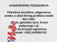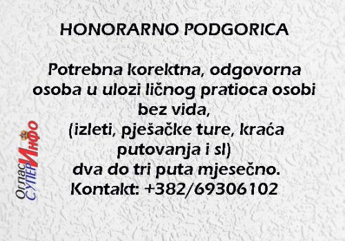 Potrebna korektna, odgovorna osoba u ulozi ličnog pratioca osobi bez vida, (izleti, pješačke ture, kraća putovanja i sl), dva do tri puta mjesečno.